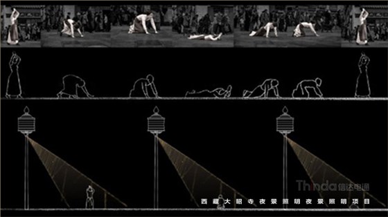 3)重大節(jié)日模式下所有照明燈具全開(kāi),重要節(jié)點(diǎn)投影經(jīng)文開(kāi)啟,使大昭寺成為一個(gè)巨大的轉(zhuǎn)經(jīng)筒與朝拜的人一起緩緩轉(zhuǎn)動(dòng)。