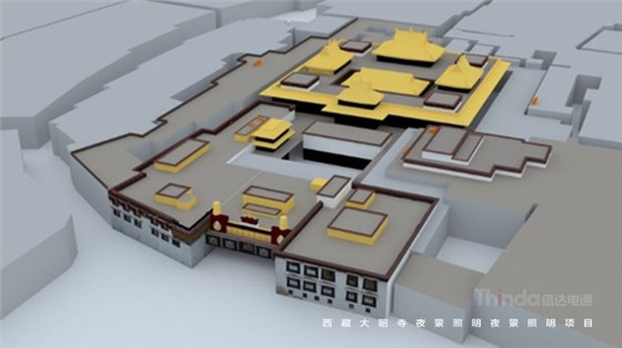 大昭寺是四層樓的碉堡式建筑結(jié)構(gòu),各殿宇樓頂形狀高低不一,為全面營(yíng)造金頂?shù)囊归g氛圍,信達(dá)科技采用投光燈投射金頂?shù)脑O(shè)計(jì)方案。投光燈分布在圍繞大昭寺的十個(gè)點(diǎn)位上,根據(jù)被照物高度、角度設(shè)置燈具數(shù)量、高度、角度、方向,以實(shí)現(xiàn)金頂?shù)恼w亮度統(tǒng)一。