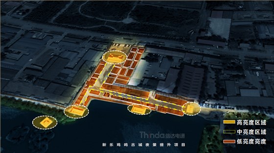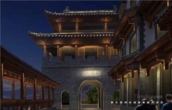 亮化設(shè)計(jì)從宏觀和微觀兩種尺度入手:在宏觀上強(qiáng)調(diào)整體性,建立清晰的夜景結(jié)構(gòu)并區(qū)分主次,體現(xiàn)青磚黛瓦,淡雅風(fēng)華,那種褪盡喧囂之后的寧?kù)o和內(nèi)斂。在微觀上,以人為本實(shí)現(xiàn)照明的舒適性,營(yíng)造溫馨雅致的光環(huán)境。本案中雞鳴古城亮化設(shè)計(jì)將主入口處城樓及親水樓臺(tái)為高亮度區(qū)域,沿街立面烘托商旅氛圍為中亮度,建筑頂部營(yíng)造靈境、淡雅的光環(huán)境,弱化表現(xiàn)為低亮度區(qū)域。主體光色以暖光呈現(xiàn),靜態(tài)光為主。燈光主要體現(xiàn)其渾厚、大氣的建筑結(jié)構(gòu),打造整體感與形態(tài)美,滿足建筑自身功能和精神需求的同時(shí),突出顯著入口標(biāo)志。以間隔小投光形式呈現(xiàn),突出入口醒目標(biāo)志和節(jié)點(diǎn)設(shè)計(jì)。拒絕大面積重彩潑墨,以投光進(jìn)行小范圍營(yíng)造,點(diǎn)綴成景,留白處理,避免喧鬧、浮華,營(yíng)造靜謐、文雅的氛圍。燈光錯(cuò)落有致,層次分明,有熱鬧活力的商旅氛圍,也有溫馨雅致的古典情懷,使人漫步其中,移步異景,感受她的舒適與雅致。