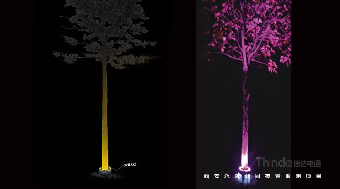 樹(shù)池內(nèi)比較筆直的樹(shù)木,采用抱箍投光燈,整潔美觀,不破壞白天景觀效果;