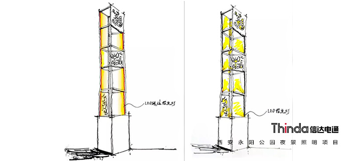 風(fēng)車(chē)景觀架現(xiàn)有底部投光照明,效果不理想,光溢散嚴(yán)重,建議逐層安裝小投光燈,將風(fēng)車(chē)打亮;
