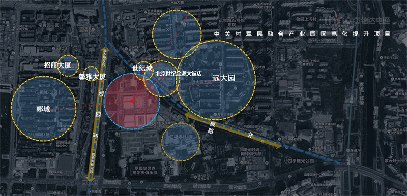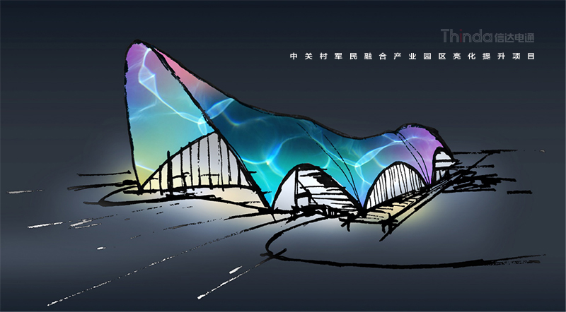 中關村軍民融合產業園區的亮化設計主要以建筑燈光為主體設計方向,用燈光的形式突出建筑結構特點,突出時尚、創新、科技、新潮的融合產業園。園區建筑結構整體簡潔、大氣,信達利用光影效果及景觀元素,打造東西、南北軸向的建筑縱身層次,整體以各種幾何形體組合而成,燈光在設計的同時尊重建筑本身的理念,優化夜景氛圍,通過塊與面的結合,塑造一個大氣魄、大追求的文化產業新品牌。