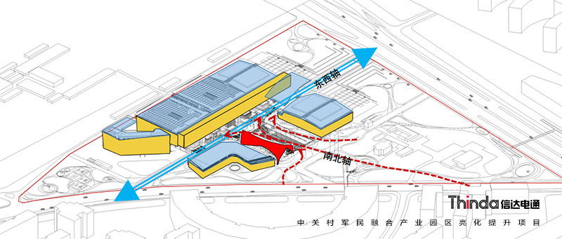 園區亮化設計的建筑空間分析:建筑結構整體簡潔、大氣,利用光影效果及景觀元素,打造東西、南北軸向的建筑縱身層次,在夜晚燈光的營造下形成點線面的整體片區,塑造區域文化熱點。